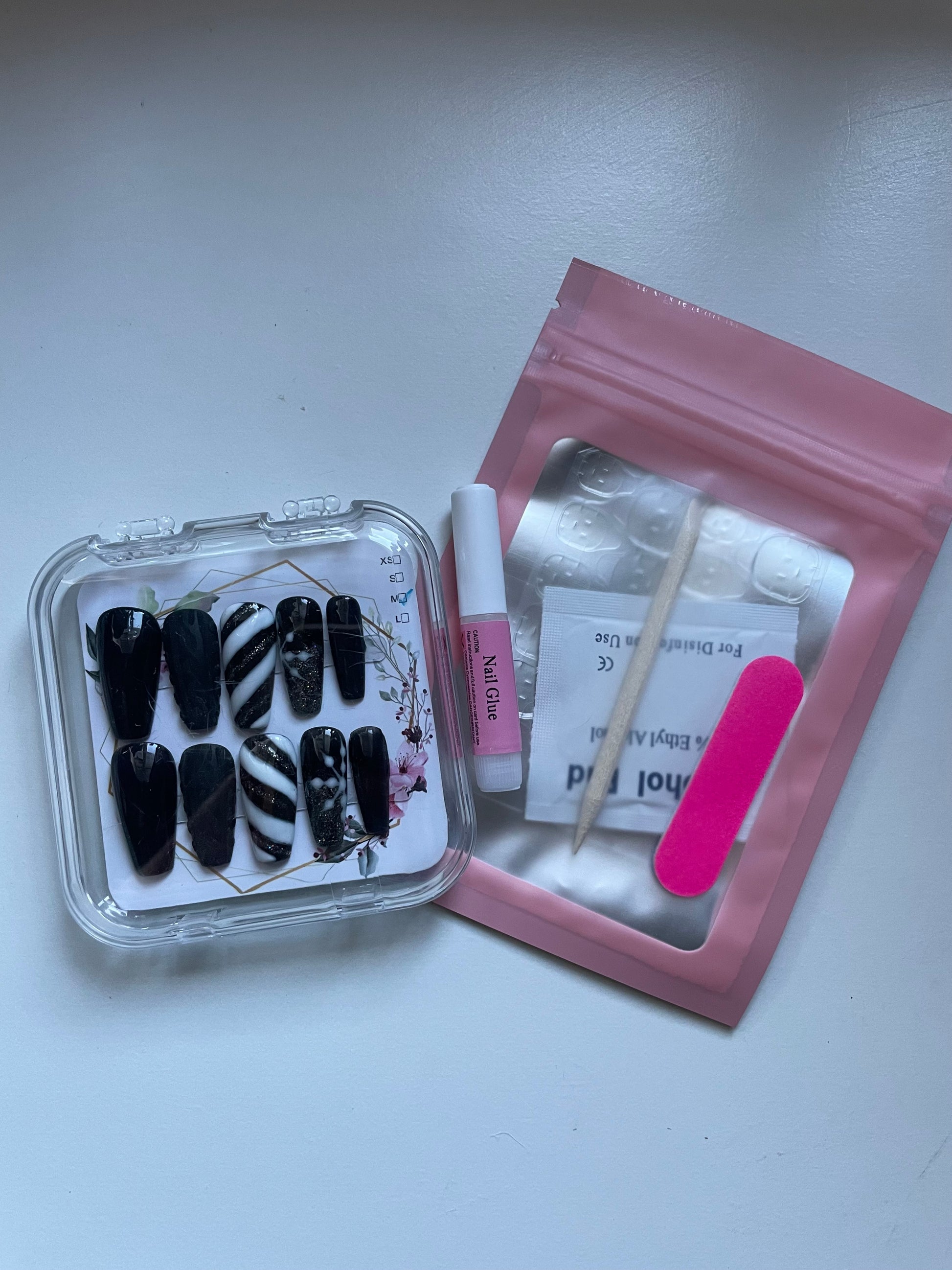 ✨Winter glam in one set! These black press-on nails feature cozy sweater-knit details, sparkling snowflakes and festive candy cane art. Bold, chic and perfect for the holiday season ❄️💙
